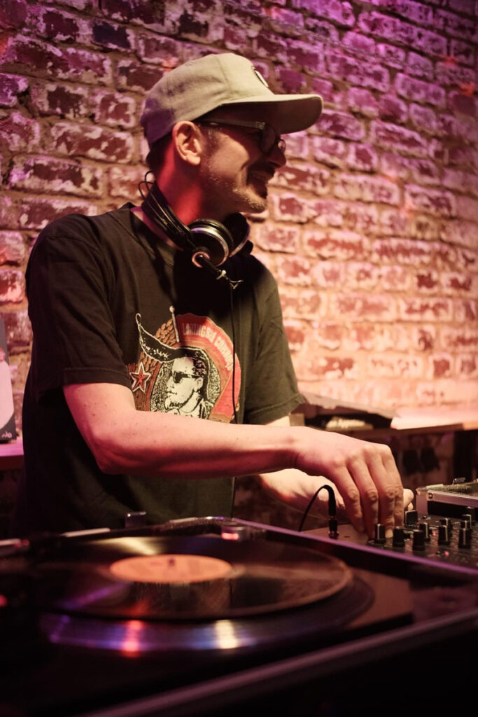 Reinhold Janowitz, laut Instagram-Profil „Selbst, ständig, Kommunikationsdesigner, verheiratet, Vater von drei Erwachsenen, Music, @niederridebuddies #Gravelbike #Gegenwartskunst #Vinyl. Treibt seit 30 Jahren als Kommunikationsdesigner in Krefeld, dann Düsseldorf und nun wieder in Krefeld sein Wesen … ansonsten Hans-Gas-in-allen-Dämpfen, die mit Kunst, Kultur und Musik zu tun haben. Unter anderem arbeitet er für das NLH, hat die Website kulturinkrefeld.de mit entwickelt und selten findet man ihn auch mal hinter einem anderen Plattenteller als seinem eigenen, z.B. in der Kulturrampe oder nun erstmals im Schlachthof.